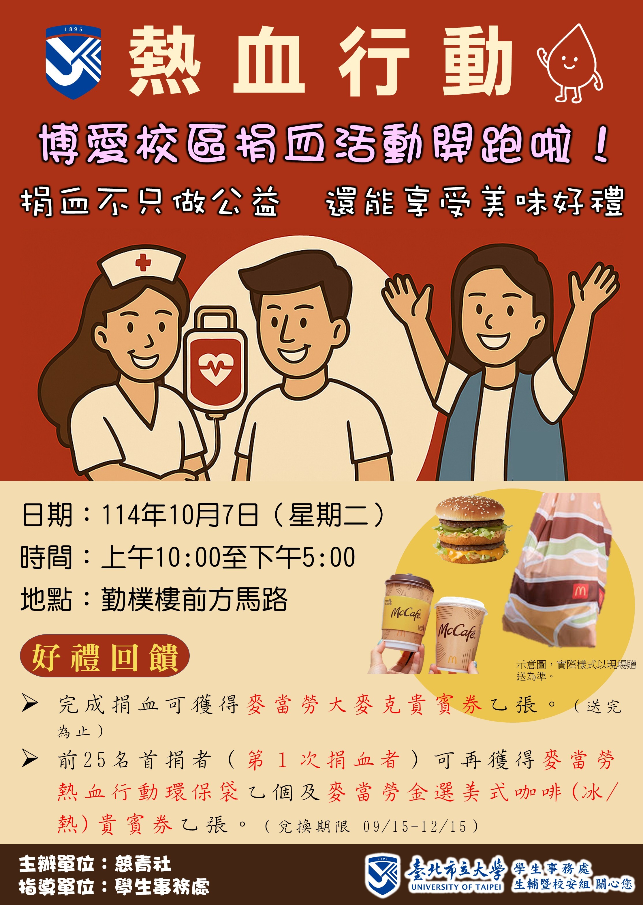 【學生事務處公告】🩸 熱血行動 ,就是今天/ 博愛校區捐血活動需要您的參與!