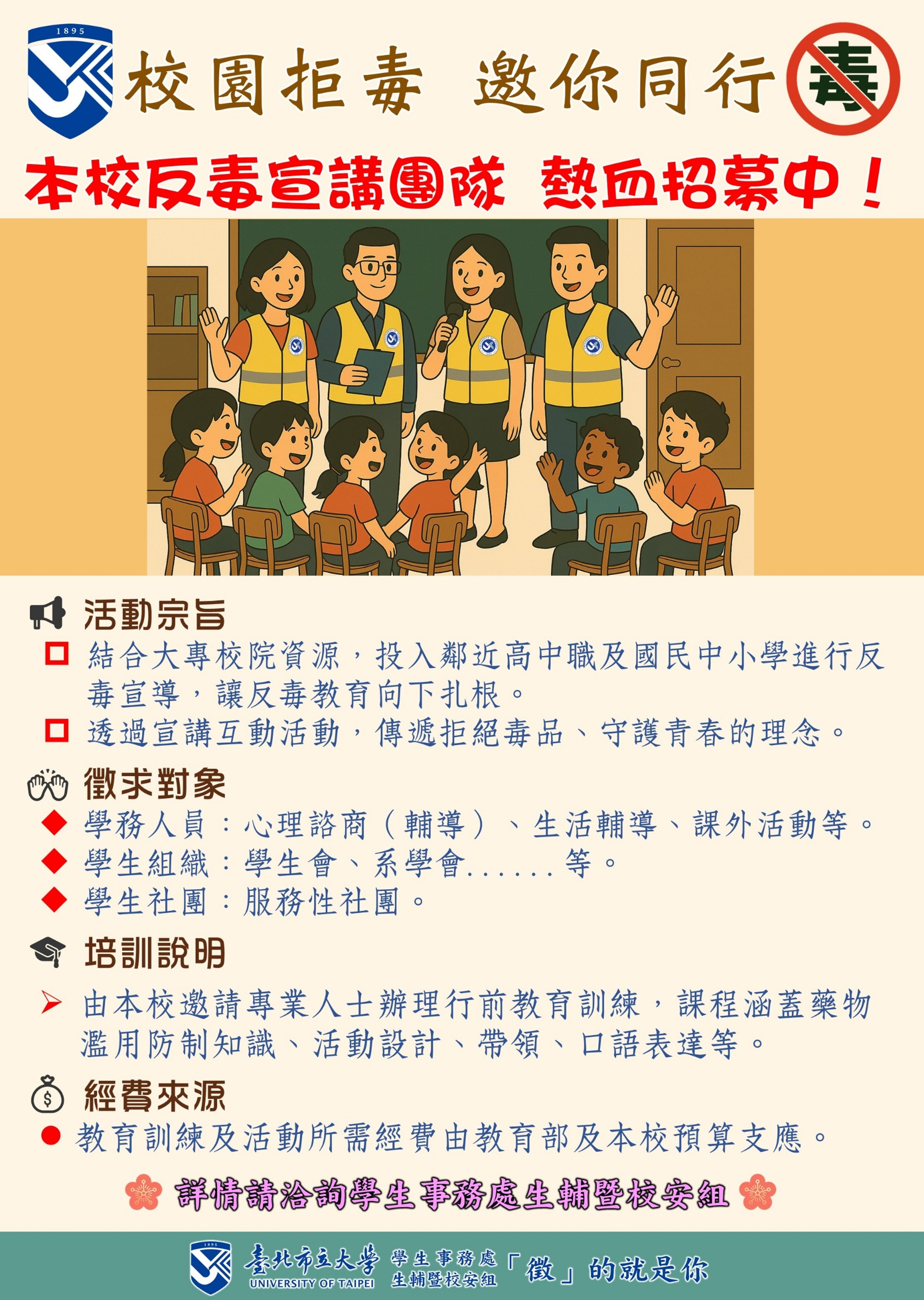 - 各服務性社團:社團指導老師、社團幹部及其成員等有意願擔任反毒宣導工作之同學、志工。