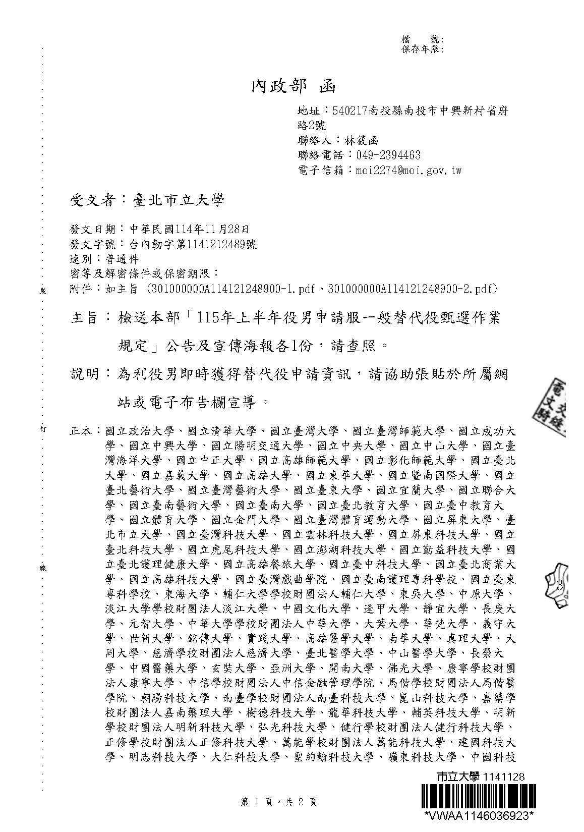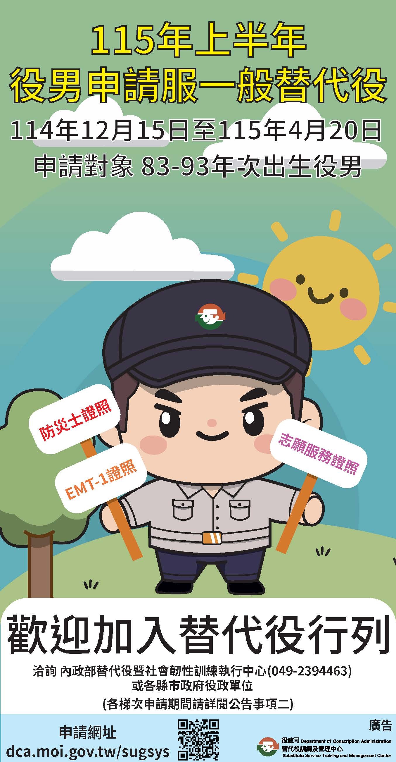【兵役訊息】內政部「115年上半年役男申請服一般替代役甄選作業」公告